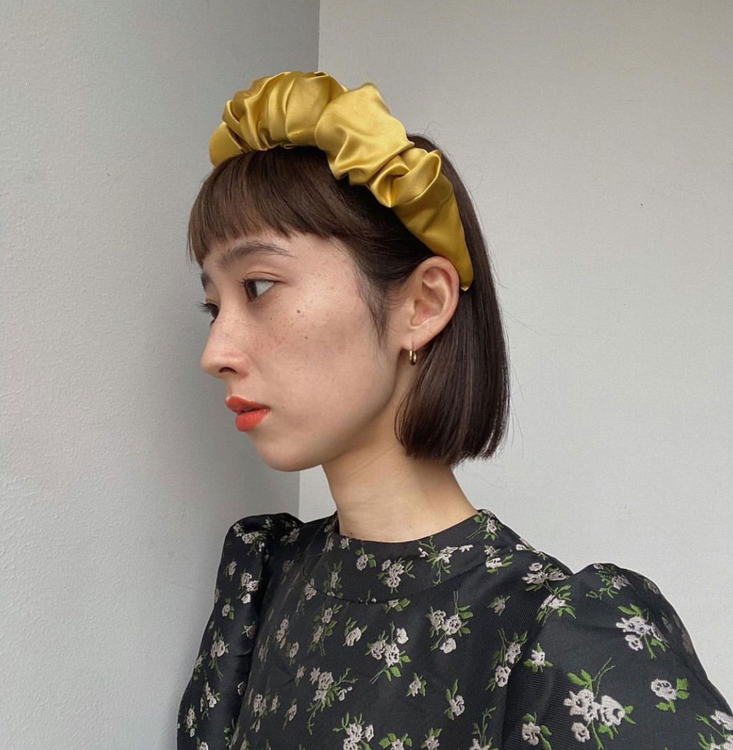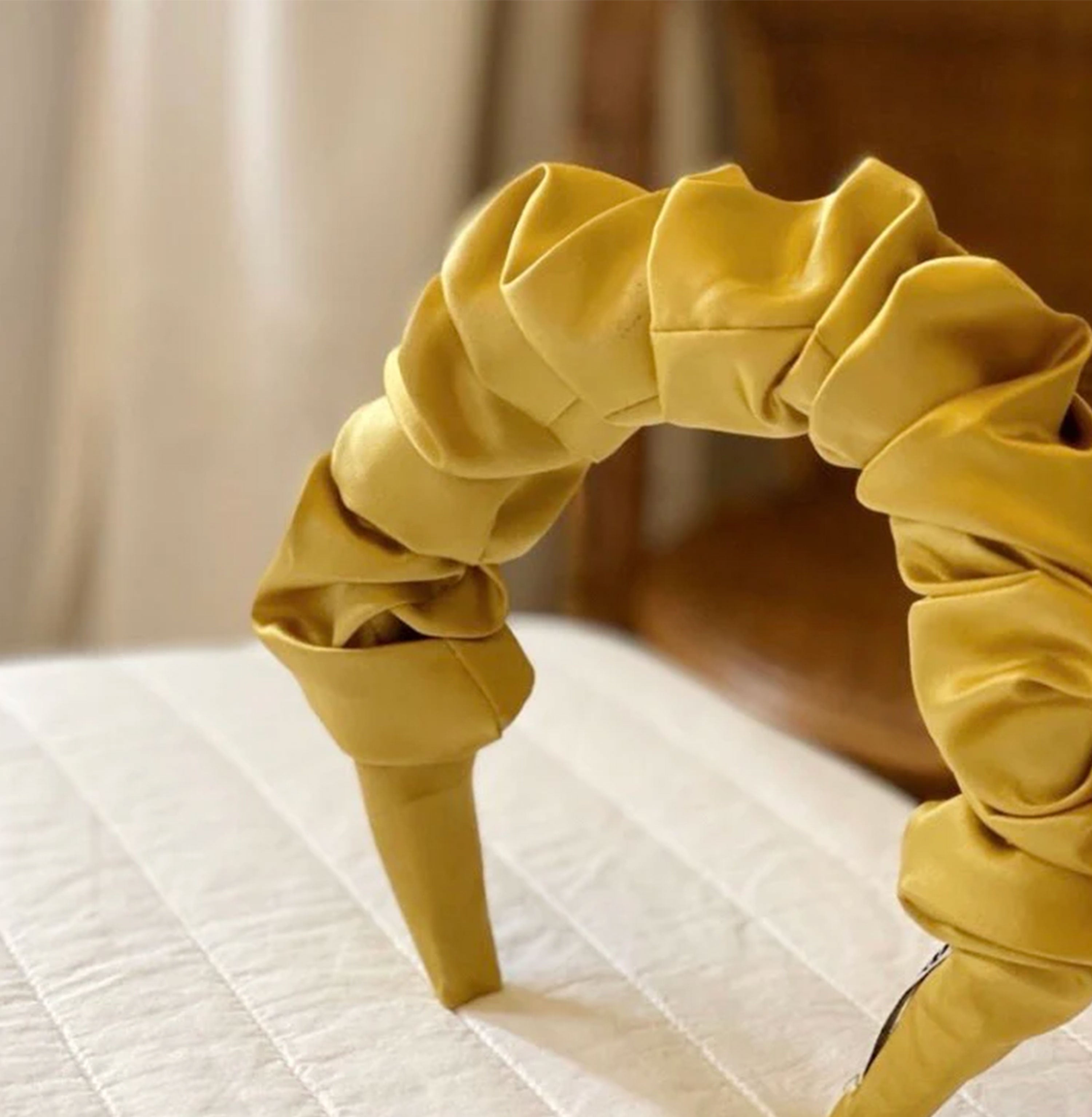The curly and soft headpiece you need for this season: an exuberant satin headband to adorn the face with pleating and waves. The perfect face-framer. Suitable for all face shapes and hair styles.