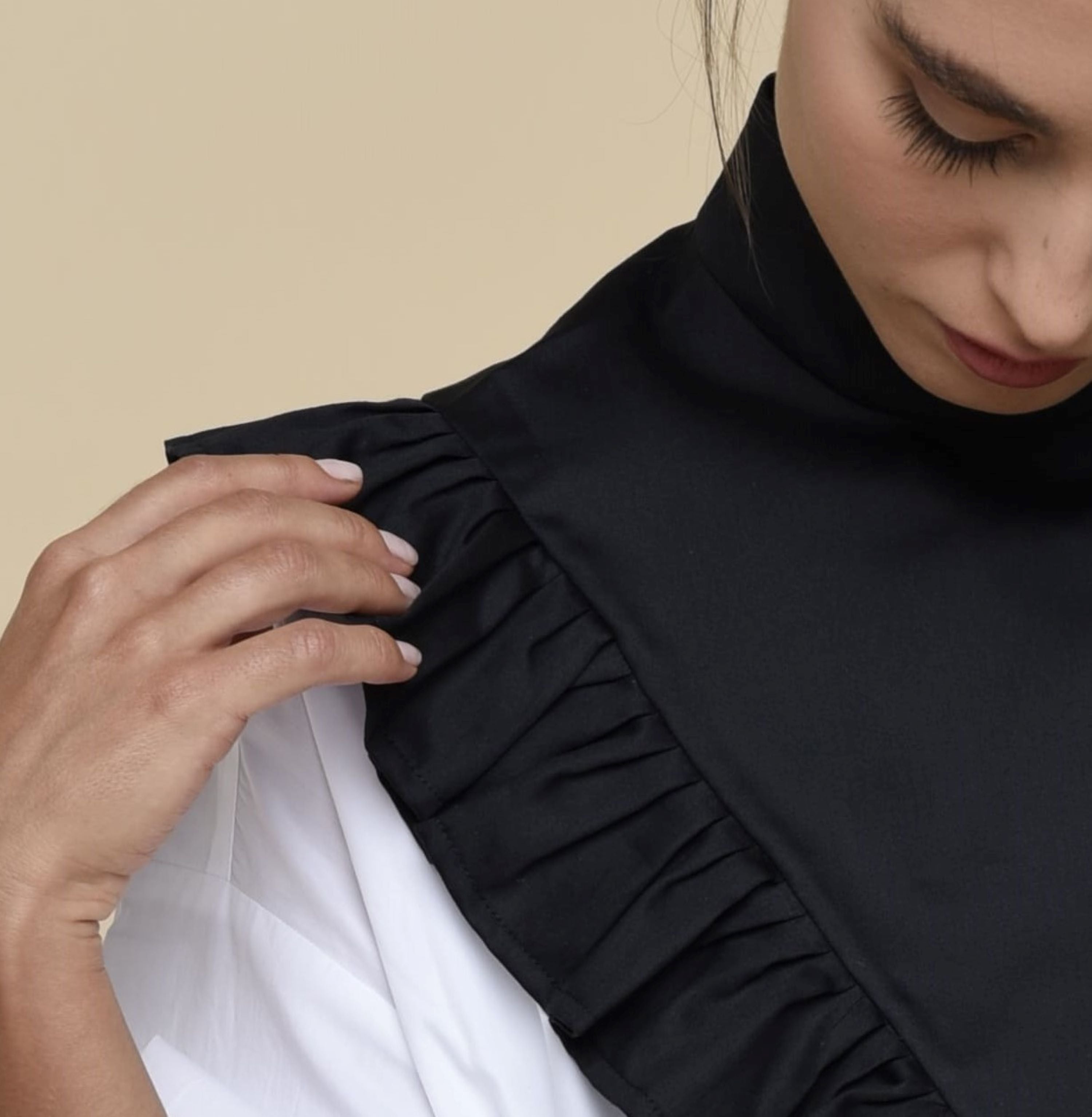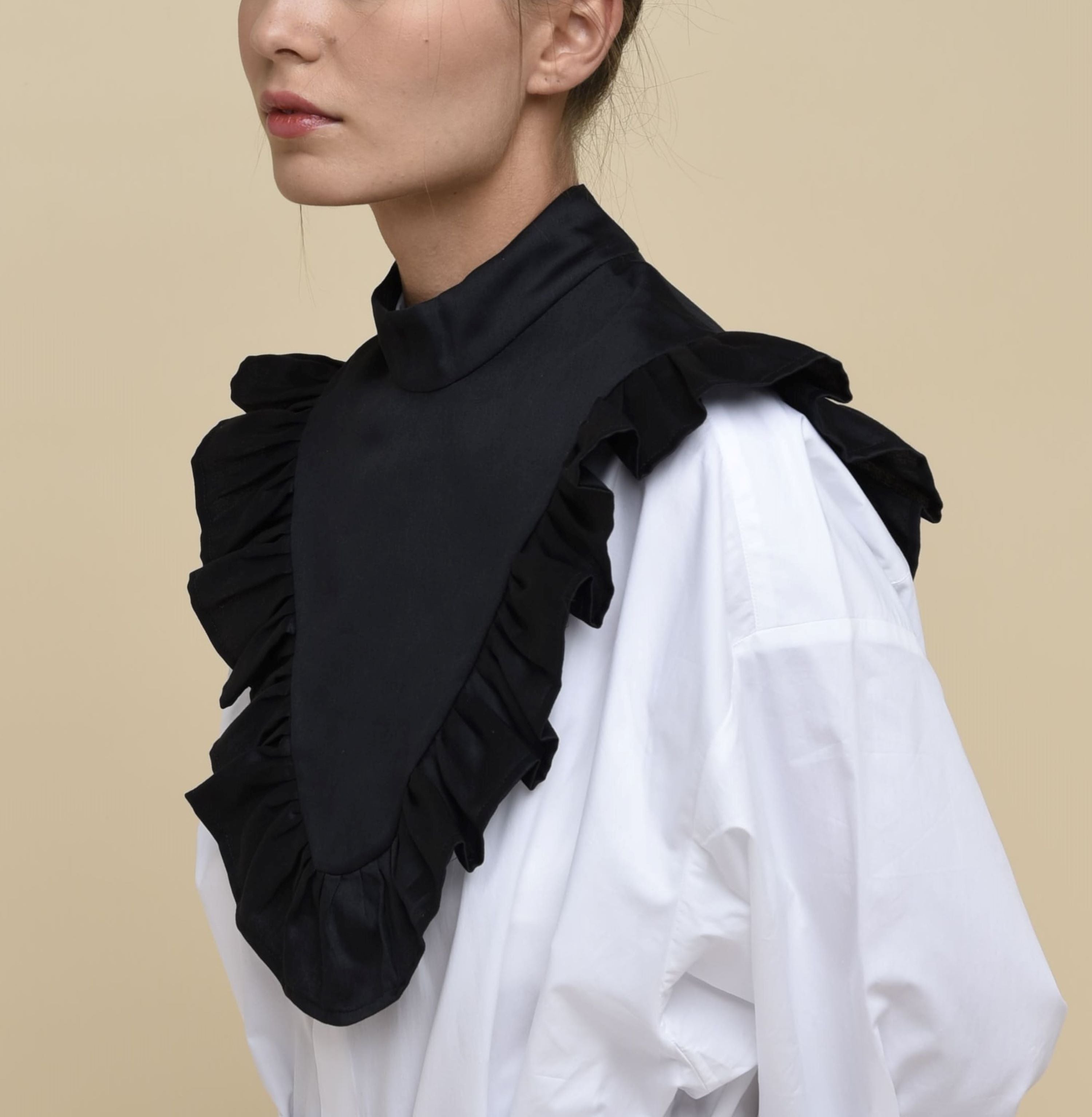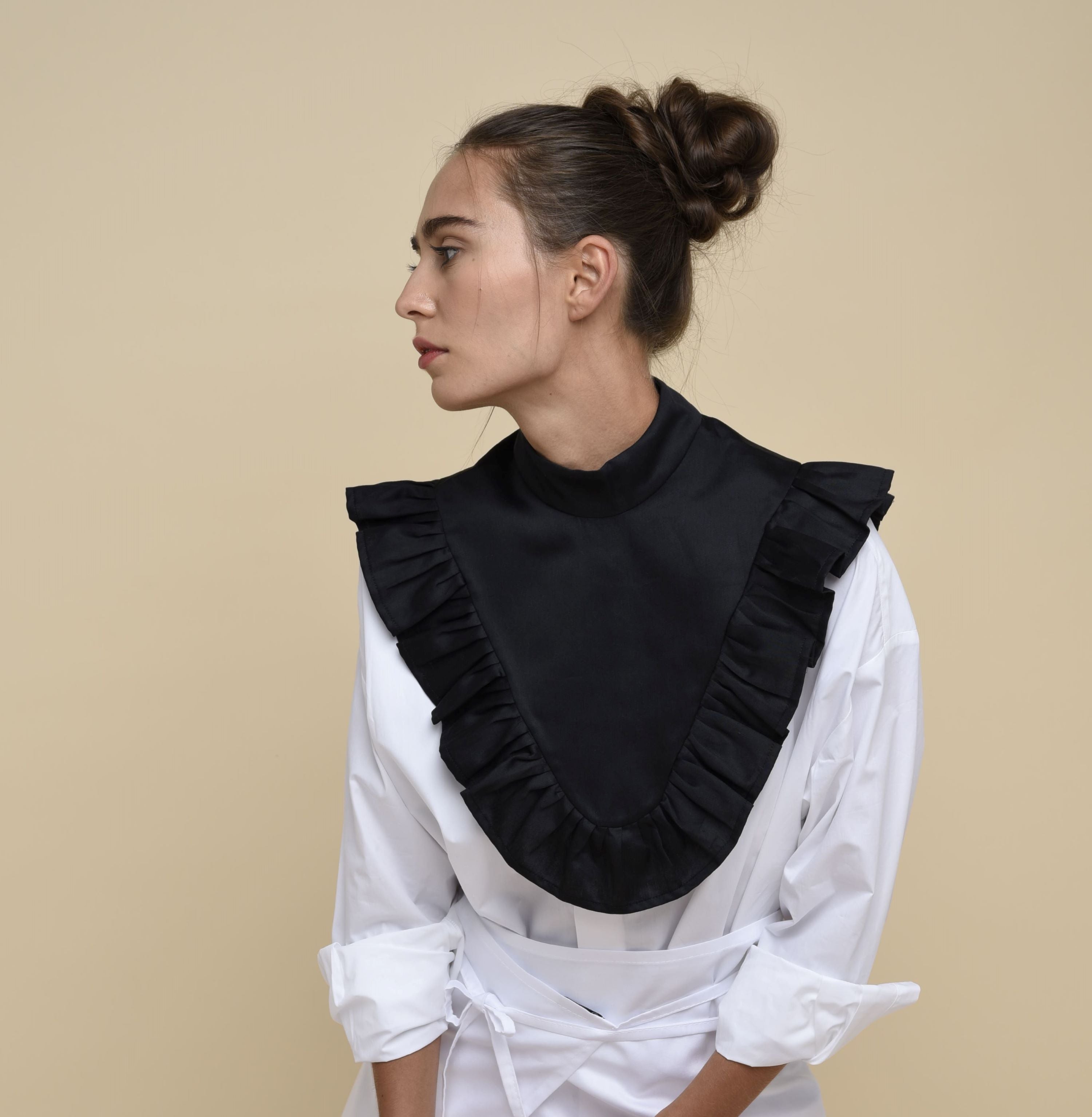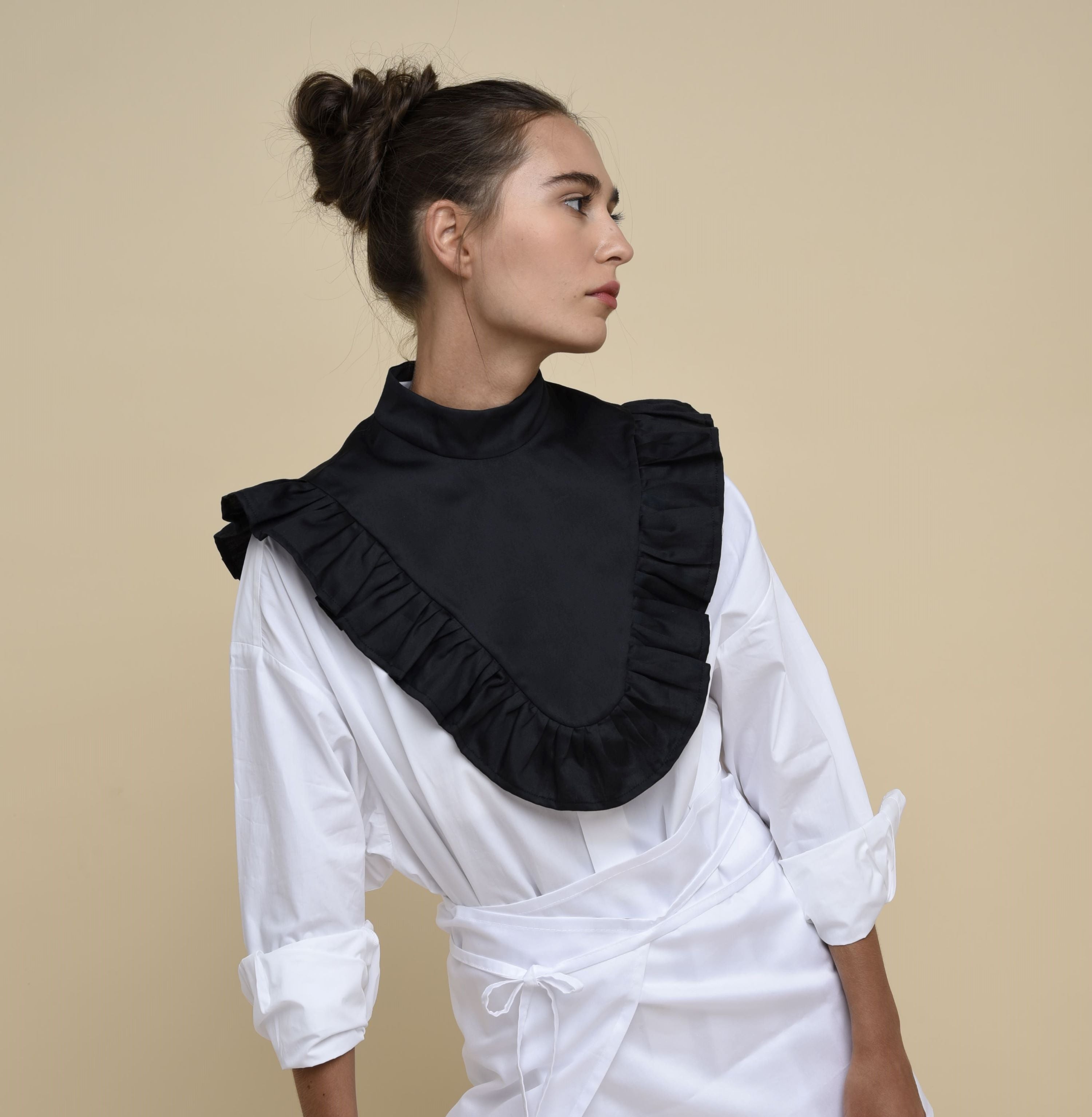 This Pleated Detachable Collar is our reinterpretation of the iconic collar that was worn for the first time by men and women in MidSixteenth Century. The ruff with pleating and flounces perfectly fit any kind of style giving a kinky twist. Instantly upgrade your outfit just by layering it over a T-shirts, a cardigan, a jumper, a coat. Made from cotton with silk effect and finished with a button.